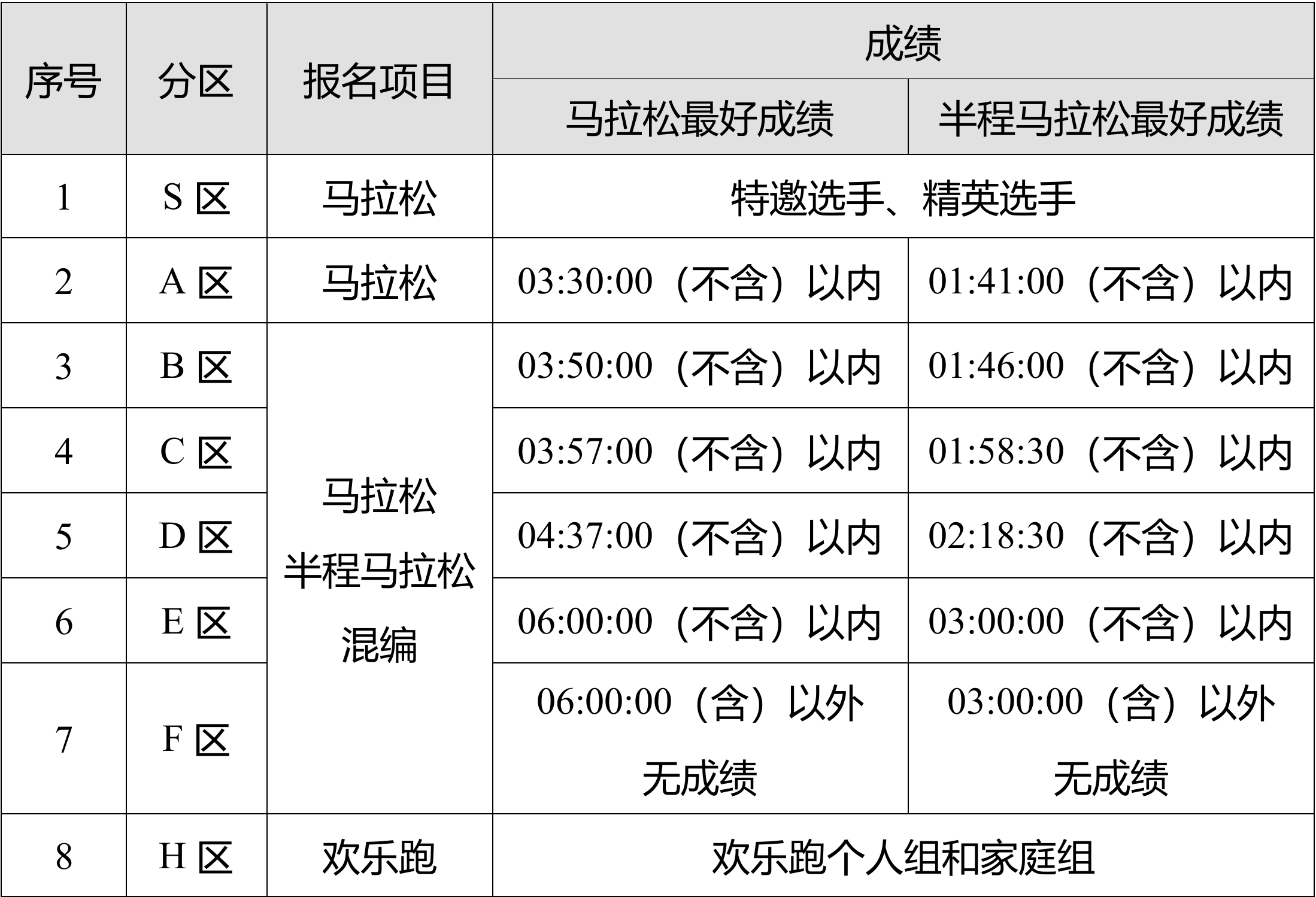 注:根据选手的马拉松、半程马拉松个人最好成绩,只要其中之一符合各分区成绩要求,编入相应分区。