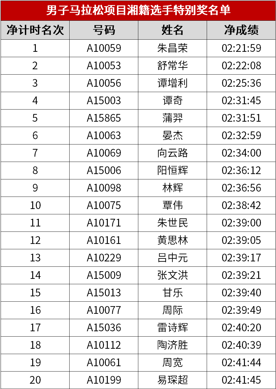 注:1.选手身份以身份证号码信息为准,按湘籍选手特别奖的净成绩排名顺序依次录取。
